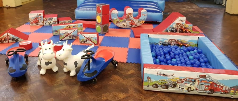 Comprising of a 17 piece set with a 2 seat rocker, slide and our 5 foot ball pool with balls, 2 didi cars and 2 happy hopperz.